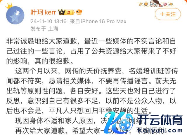 11月10日午间,黄晓明女友叶珂在微博发文,称这两个月以来网传的天价扶养费、名媛培训班等听说齐伪善。并对近日一些网罗言论暗示对不起,决定退网,追忆巩固自高的生计。叶珂发文后,“叶珂退网”这一词条马上“爆”上微博热搜主榜第一。