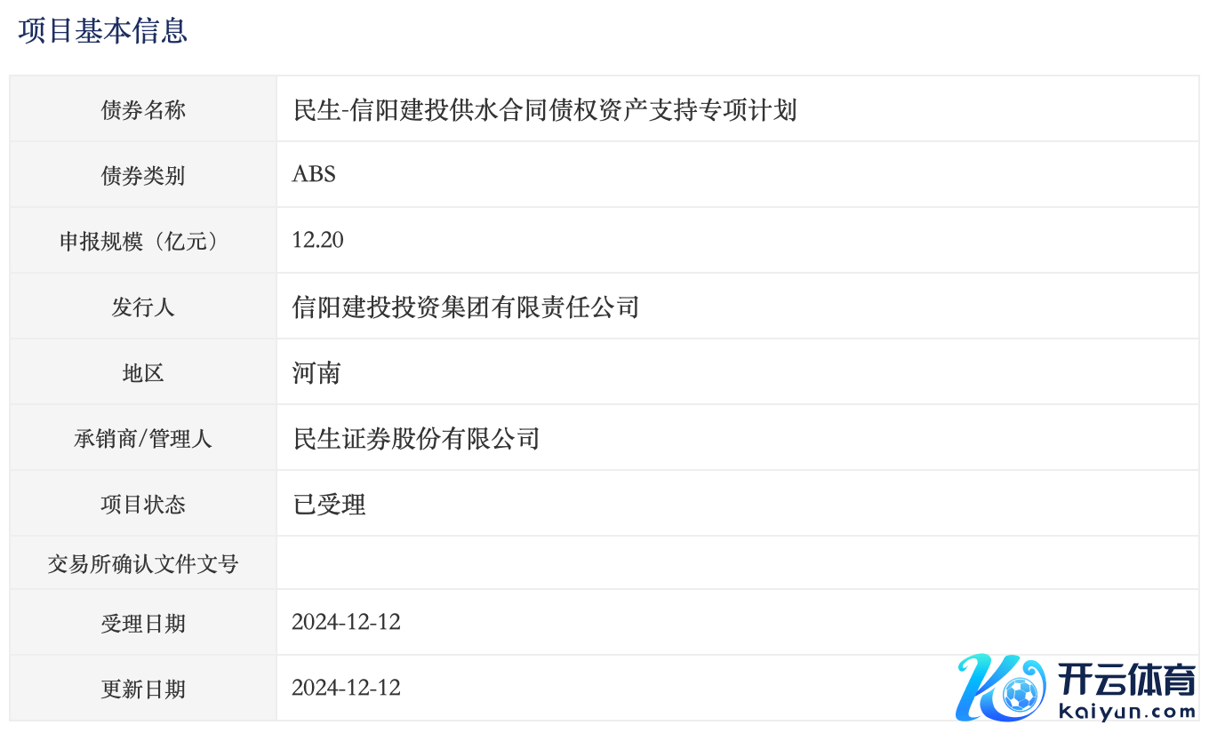 【大河财立方音书】12月12日,民生-信阳建投给水公约债权财富撑抓专项瞎想技俩欧洲杯体育,已获深交所受理。本期债券拟刊行金额为12.20亿元欧洲杯体育,承销商/处分东说念主为民生证券。2024年7月26日,中证鹏元赋予刊行东说念主主体AA+信用评级,测度矫捷。