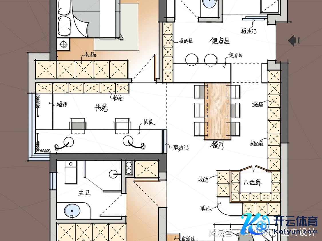 3、北向次卧扩大作念小孩房,中间次卧消除墙体改为半开放式书斋,必要时也不错和小孩房酿成孤立空间。闲居开放书斋门,后光通过书斋引入到餐厅,西晒阳光不错有用改善餐厅的采光戒指,延长当然采光的时期;